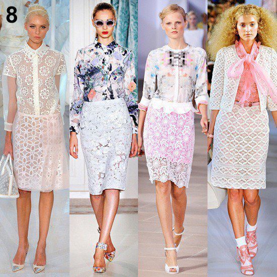Если в офисе не введен строжайший дресс - код, то кружево будет вполне уместно и на работе. Это юбки –карандаши из кружева на лаконичной подкладке в тон, как это представлено в коллекции Доменико Дольче и Стефано Габбана. Или кружевное платье – футляр в сочетании со строгим классическим пиджаком. Так же в тренде будут кружевные юбки в сочетании с однотонными строгими пиджаками. Фото 7,8,9.