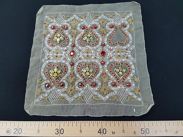 Аппликация красно-бежевая из стекляруса и страз на бежевой органзе 27*27см Арт. F-5027