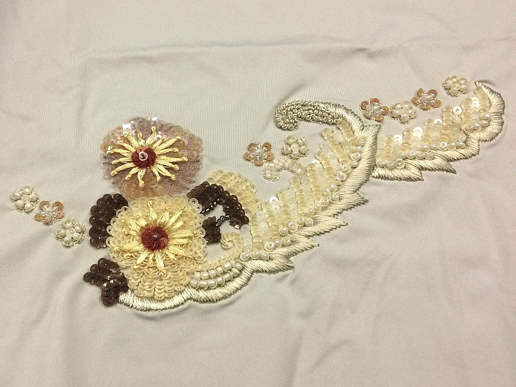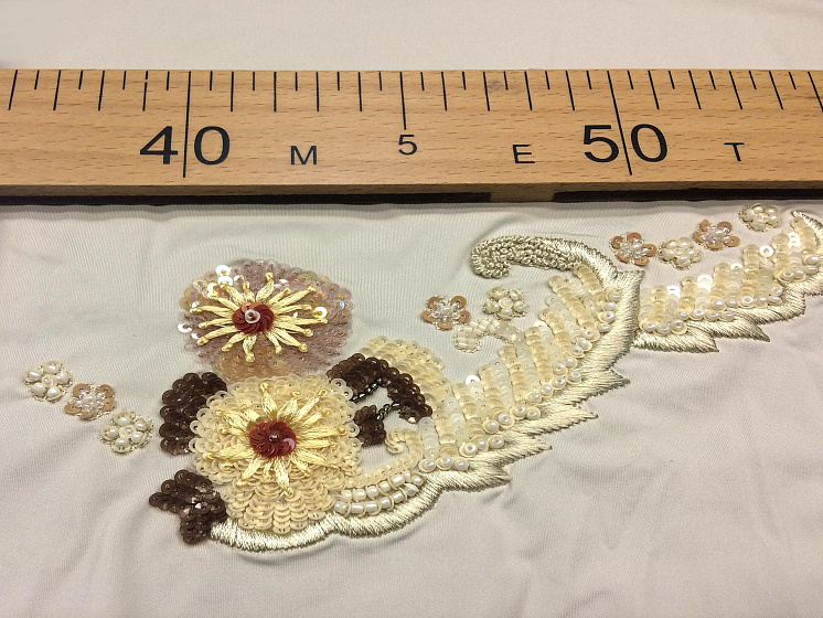 Аппликация вышивка из пайеток и бисера на бежевом трикотаже Blumarine - цена 1 000 ₽ У нас самые доступные цены на в Москве, доставка по всей России - интернет магазин тканей Тессутидея. Артикул товара для заказа - F-3289. Страна производства ткани – Италия. Ширина этого материала - . Состав - . Наличие остатков на складе - 2