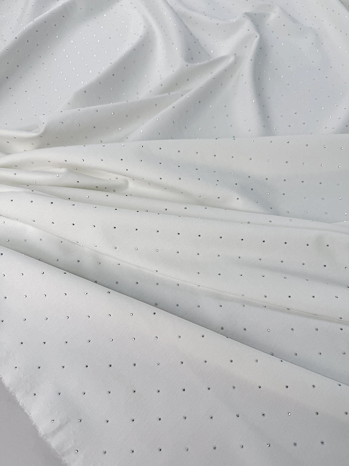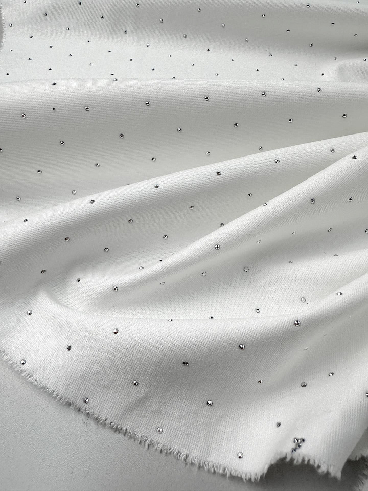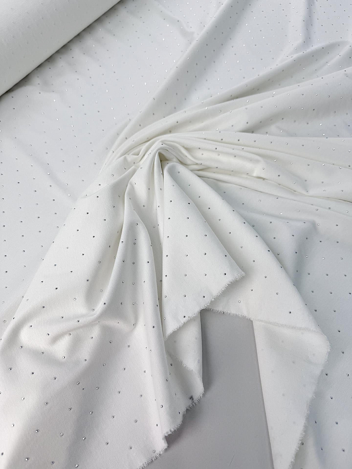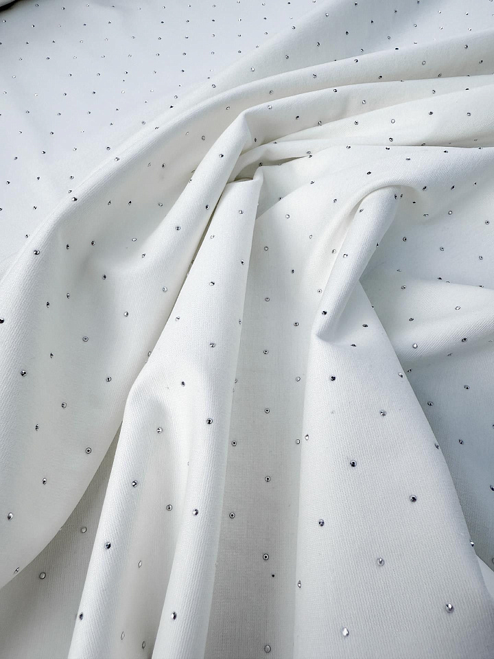 Джерси со стразами (о) белое - цена 2 600 ₽ У нас самые доступные цены на Джерси в Москве, доставка по всей России - интернет магазин тканей Тессутидея. Артикул товара для заказа - 13-1664. Страна производства ткани – Италия. Ширина этого материала - 150. Состав - Хлопок 65% нейлон 30% эластан 5%. Наличие остатков на складе - 8 м