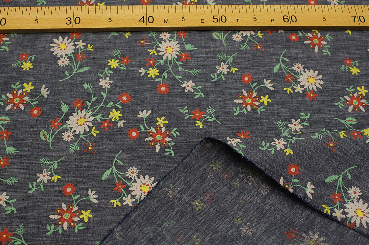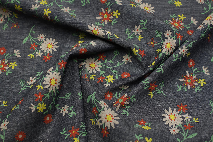 Джинса сорочечная (н) цветочный принт на синем меланже - цена 2 400 ₽ У нас самые доступные цены на Джинсовые ткани в Москве, доставка по всей России - интернет магазин тканей Тессутидея. Артикул товара для заказа - 01-7826. Страна производства ткани – Италия. Ширина этого материала - 145. Состав - Хлопок 100%. Наличие остатков на складе - 12.7 м