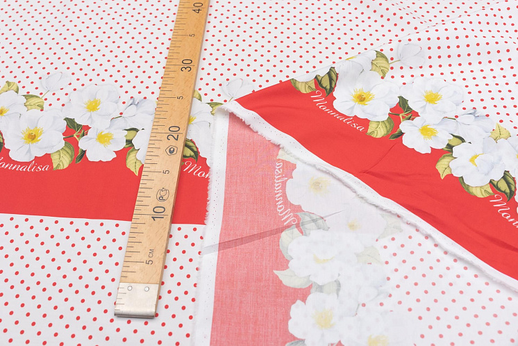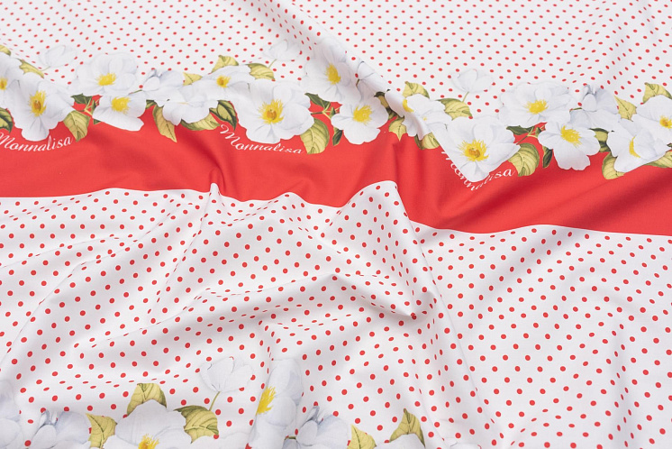 Хлопок бордюры (н) белые цветы и горох на красно-белом - цена 2 500 ₽ У нас самые доступные цены на Хлопок набивной в Москве, доставка по всей России - интернет магазин тканей Тессутидея. Артикул товара для заказа - 01-6912. Страна производства ткани – Италия. Ширина этого материала - 150. Состав - Хлопок 100%. Наличие остатков на складе - 12.8 м
