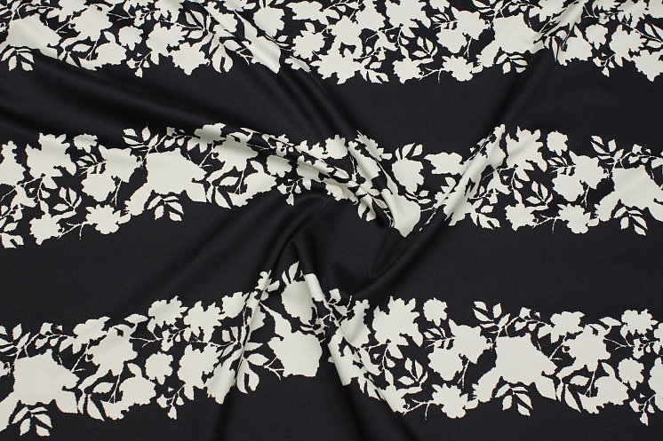 Хлопок стрейч 270 г/м (н) белый растительный рисунок стилизованные полосы на темно-синем - цена 1 900 ₽ У нас самые доступные цены на Хлопок набивной в Москве, доставка по всей России - интернет магазин тканей Тессутидея. Артикул товара для заказа - 01-7655. Страна производства ткани – Италия. Ширина этого материала - 130. Состав - Хлопок 98% эластан 2%. Наличие остатков на складе - 7.15 м