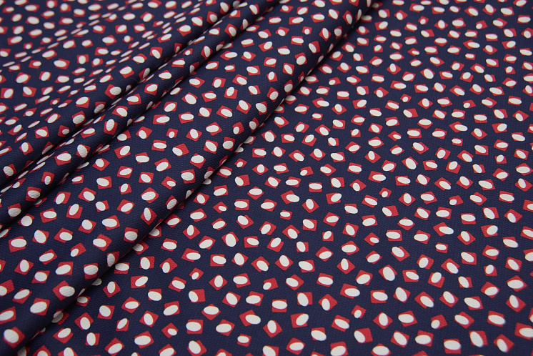 Хлопок стрейч фактурный (н) красно-белый геометрический орнамент на темно-синем - цена 1 400 ₽ У нас самые доступные цены на в Москве, доставка по всей России - интернет магазин тканей Тессутидея. Артикул товара для заказа - 01-5844. Страна производства ткани – Италия. Ширина этого материала - 145. Состав - Хлопок 98% эластан 2%. Наличие остатков на складе - 9.8 м