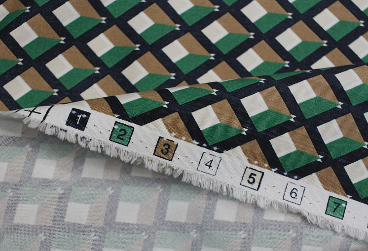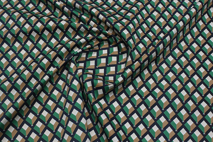 Хлопок стрейч (н) черно-бежево-зеленый геометрический рисунок - цена 1 600 ₽ У нас самые доступные цены на Хлопок набивной в Москве, доставка по всей России - интернет магазин тканей Тессутидея. Артикул товара для заказа - 01-7833. Страна производства ткани – Италия. Ширина этого материала - 140. Состав - Хлопок 97% эластан 3%. Наличие остатков на складе - 8.6 м