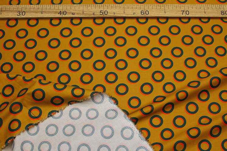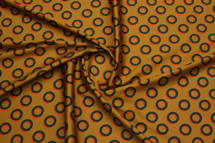 Хлопок стрейч (н) оранжево-зеленые круги на песочном - цена 2 200 ₽ У нас самые доступные цены на Хлопок набивной в Москве, доставка по всей России - интернет магазин тканей Тессутидея. Артикул товара для заказа - 01-7716. Страна производства ткани – Италия. Ширина этого материала - 150. Состав - Хлопок 98% эластан 2%. Наличие остатков на складе - 3.3 м