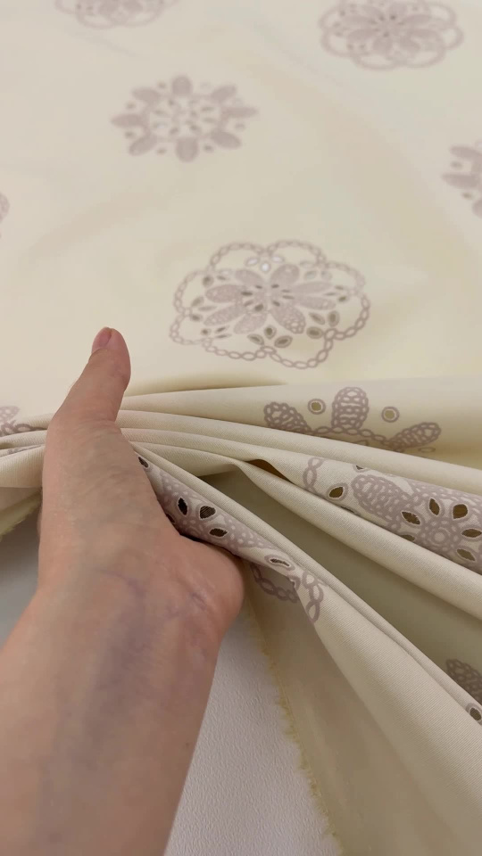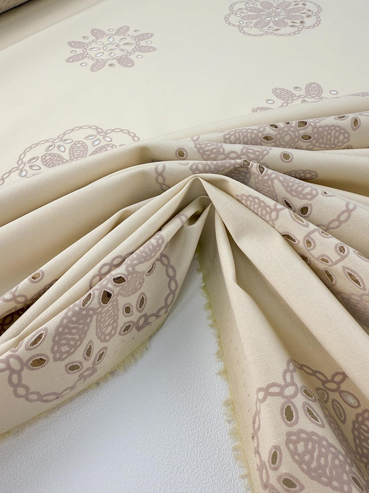 Хлопок стрейч с перфорацией (н) цветочный рисунок на бежевом - цена 2 100 ₽ У нас самые доступные цены на в Москве, доставка по всей России - интернет магазин тканей Тессутидея. Артикул товара для заказа - 01-8056. Страна производства ткани – Италия. Ширина этого материала - 150. Состав - Хлопок 97% эластан 3%. Наличие остатков на складе - 7.9 м