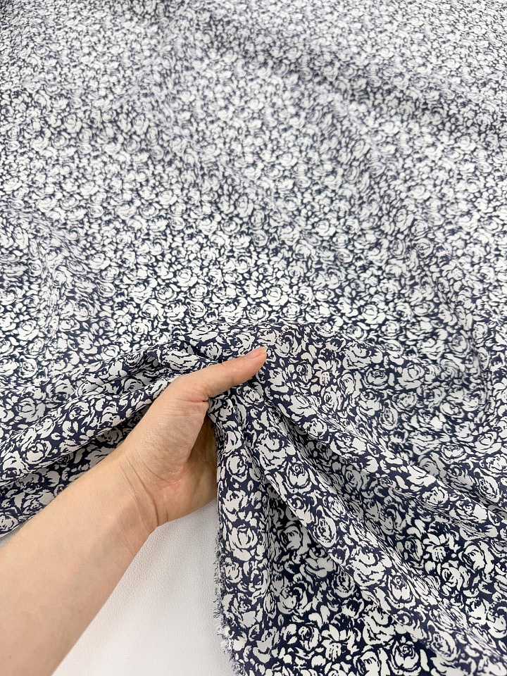 Крепдешин 70 г/м (н) белый рисунок на темно-синем - цена 4 500 ₽ У нас самые доступные цены на в Москве, доставка по всей России - интернет магазин тканей Тессутидея. Артикул товара для заказа - 10-4789. Страна производства ткани – Италия. Ширина этого материала - 135. Состав - Шелк 100%. Наличие остатков на складе - 14.6 м