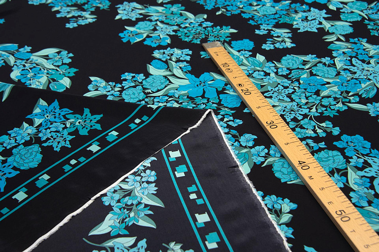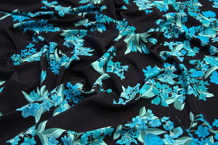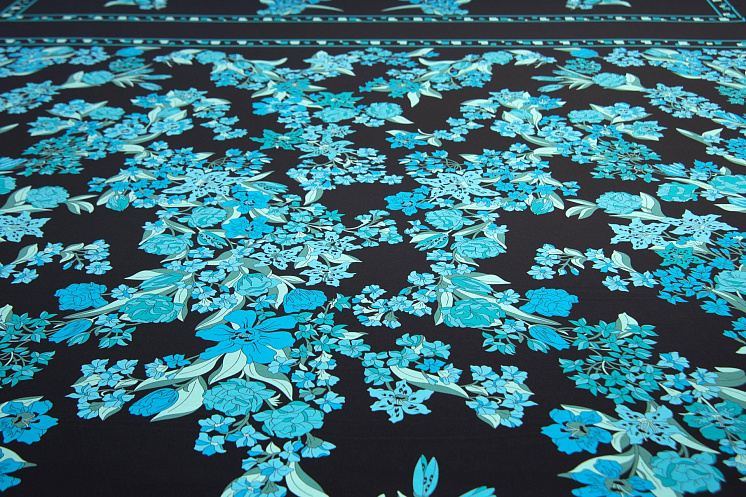 Крепдешин купон (1,95м) (н) бирюзовый цветочный орнамент на черном в стиле Bessi - цена 4 200 ₽ У нас самые доступные цены на в Москве, доставка по всей России - интернет магазин тканей Тессутидея. Артикул товара для заказа - 10-1079. Страна производства ткани – Италия. Ширина этого материала - 140. Состав - Шелк 100%. Наличие остатков на складе - 1.7 м