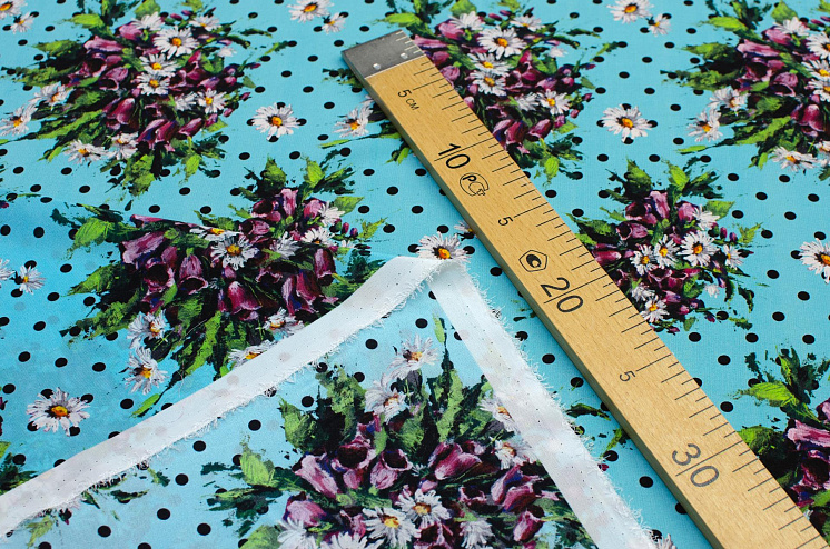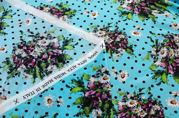 Крепдешин (н) акварельный цветочный орнамент и черный горох на бирюзовом в стиле Blumarine - цена 4 200 ₽ У нас самые доступные цены на Крепы шелковые в Москве, доставка по всей России - интернет магазин тканей Тессутидея. Артикул товара для заказа - 02-8701. Страна производства ткани – Италия. Ширина этого материала - 140. Состав - Шелк 100%. Наличие остатков на складе - 3.7 м