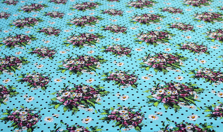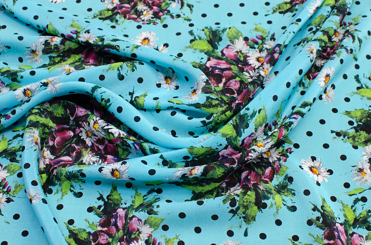Крепдешин (н) акварельный цветочный орнамент и черный горох на бирюзовом в стиле Blumarine Арт. 02-8701