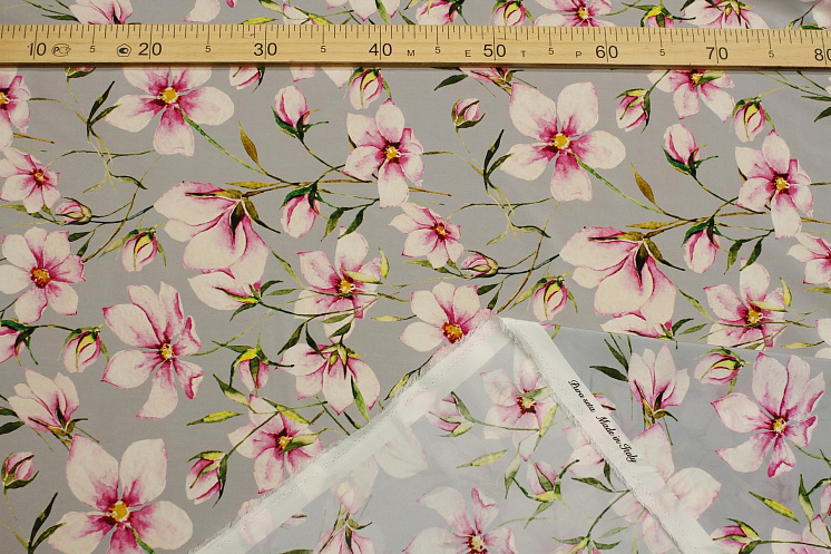 Крепдешин (н) бело-розовый цветочный рисунок на светло-сером - цена 6 600 ₽ У нас самые доступные цены на Крепы шелковые в Москве, доставка по всей России - интернет магазин тканей Тессутидея. Артикул товара для заказа - 10-3709. Страна производства ткани – Италия. Ширина этого материала - 140. Состав - Шелк 100%. Наличие остатков на складе - 4.4 м
