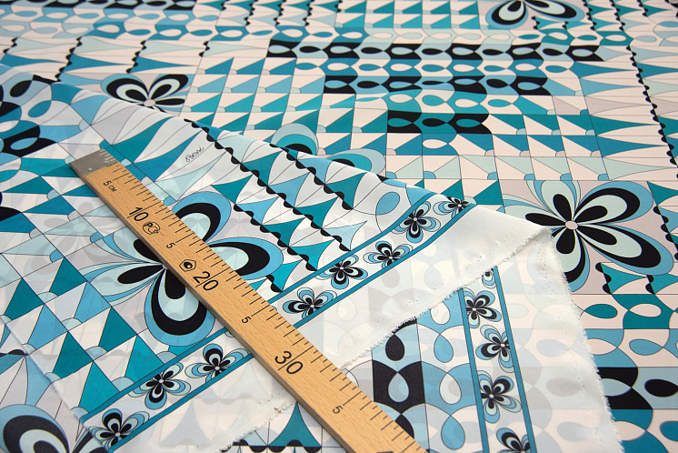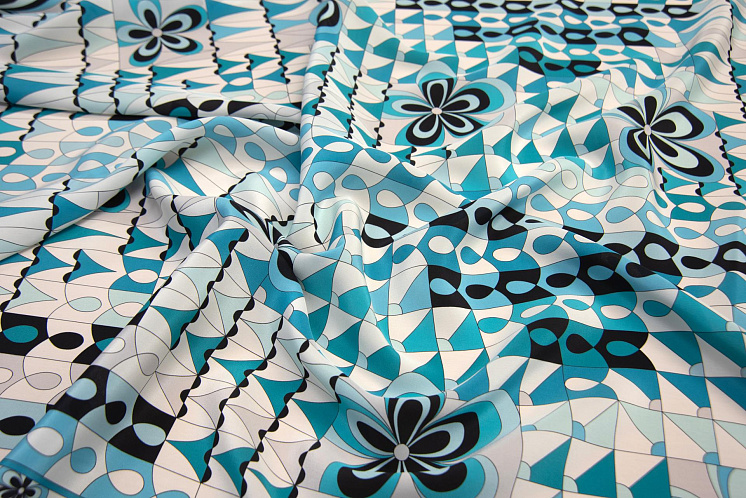 Крепдешин (н) черно-бело-бирюзовый геометрический орнамент Bessi - цена 4 200 ₽ У нас самые доступные цены на в Москве, доставка по всей России - интернет магазин тканей Тессутидея. Артикул товара для заказа - 10-1083. Страна производства ткани – Италия. Ширина этого материала - 145. Состав - Шелк 100%. Наличие остатков на складе - 10.4 м