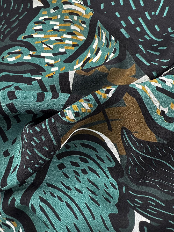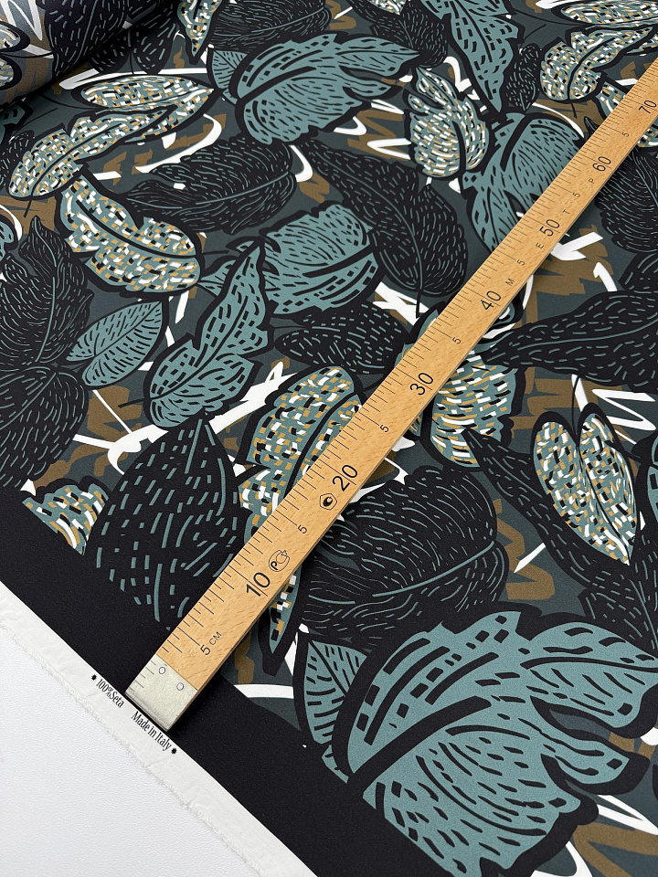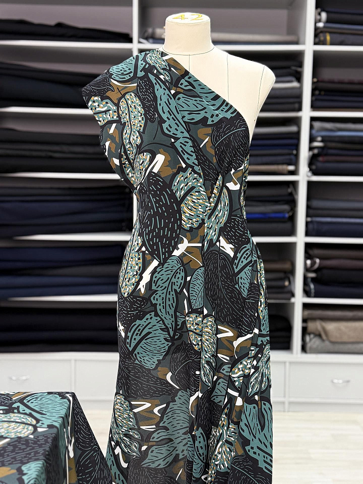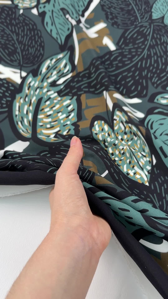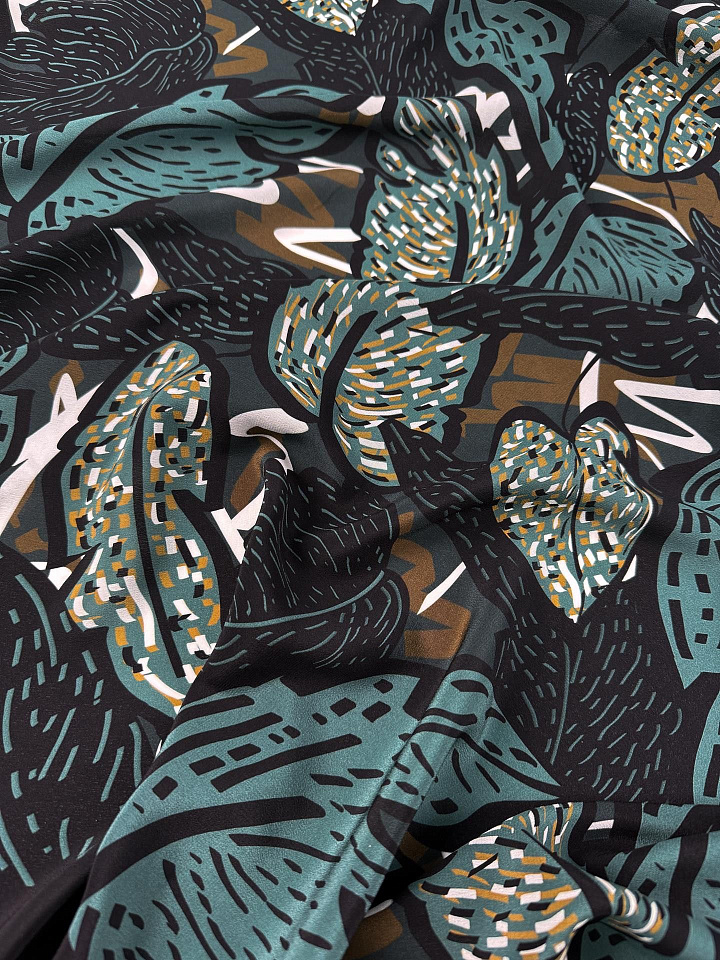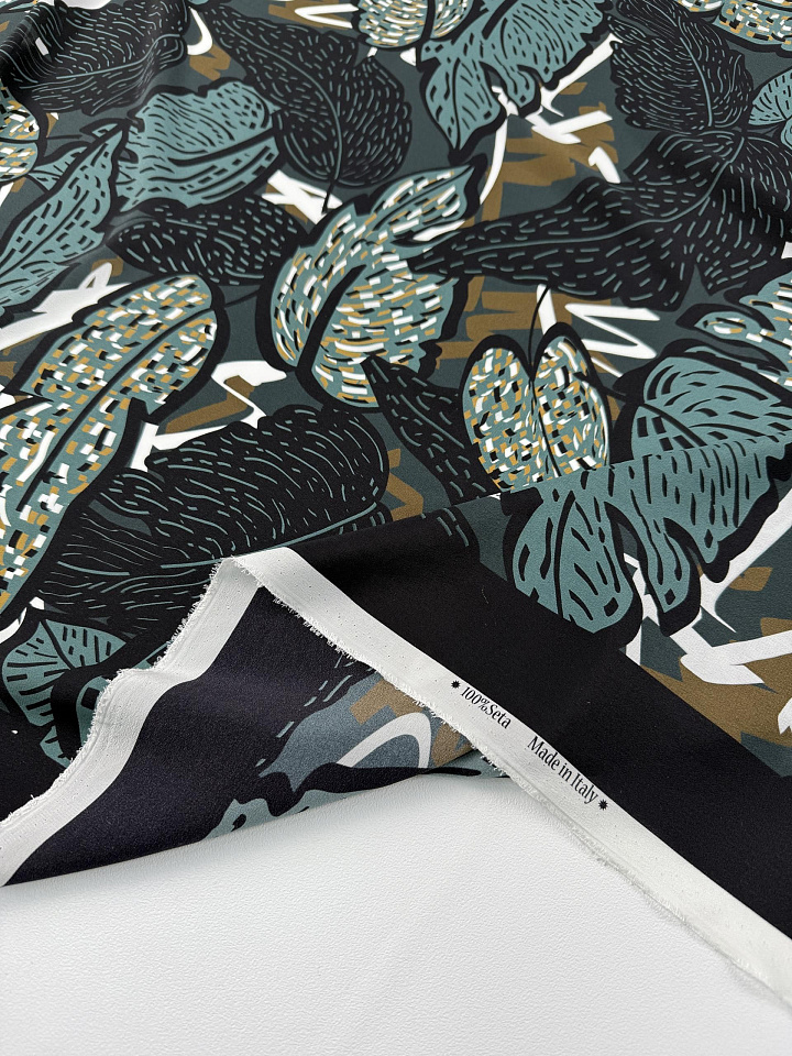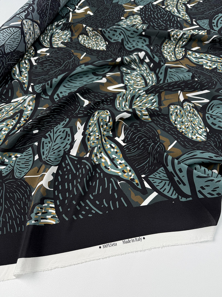 Крепдешин (н) черно-зеленый растительный рисунок - цена 7 200 ₽ У нас самые доступные цены на Крепы шелковые в Москве, доставка по всей России - интернет магазин тканей Тессутидея. Артикул товара для заказа - 10-4799. Страна производства ткани – Италия. Ширина этого материала - 135. Состав - Шелк 100%. Наличие остатков на складе - 8.7 м