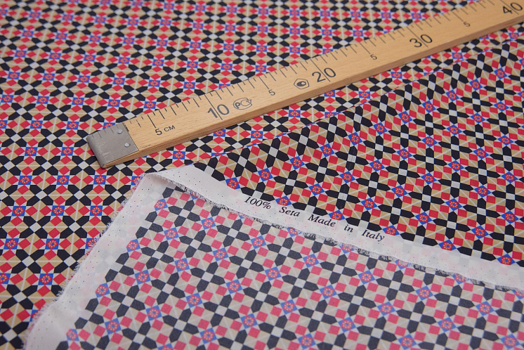 Крепдешин (н) красно-черно-бело-бежевый геометрический орнамент в стиле Prada - цена 3 800 ₽ У нас самые доступные цены на Крепы шелковые в Москве, доставка по всей России - интернет магазин тканей Тессутидея. Артикул товара для заказа - 10-2008. Страна производства ткани – Италия. Ширина этого материала - 140. Состав - Шелк 100%. Наличие остатков на складе - 1.2 м