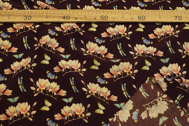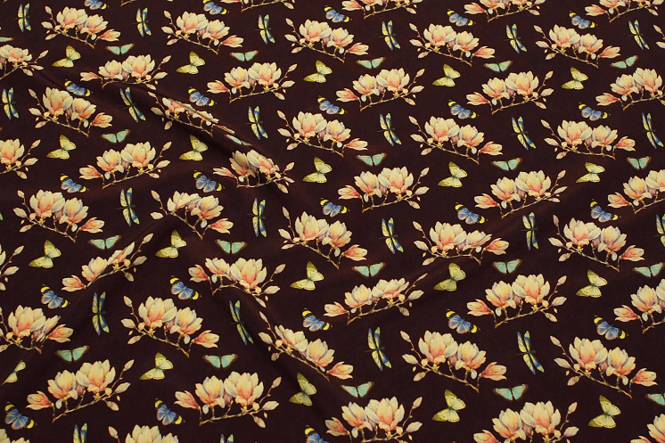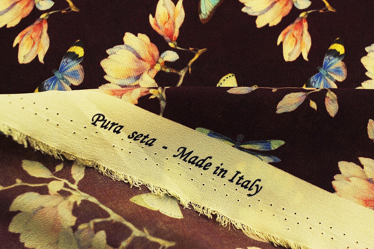 Крепдешин (н) растительный рисунок и бабочки на бордовом - цена 5 800 ₽ У нас самые доступные цены на Крепы шелковые в Москве, доставка по всей России - интернет магазин тканей Тессутидея. Артикул товара для заказа - 10-4676. Страна производства ткани – Италия. Ширина этого материала - 140. Состав - Шелк 100%. Наличие остатков на складе - 3.6 м