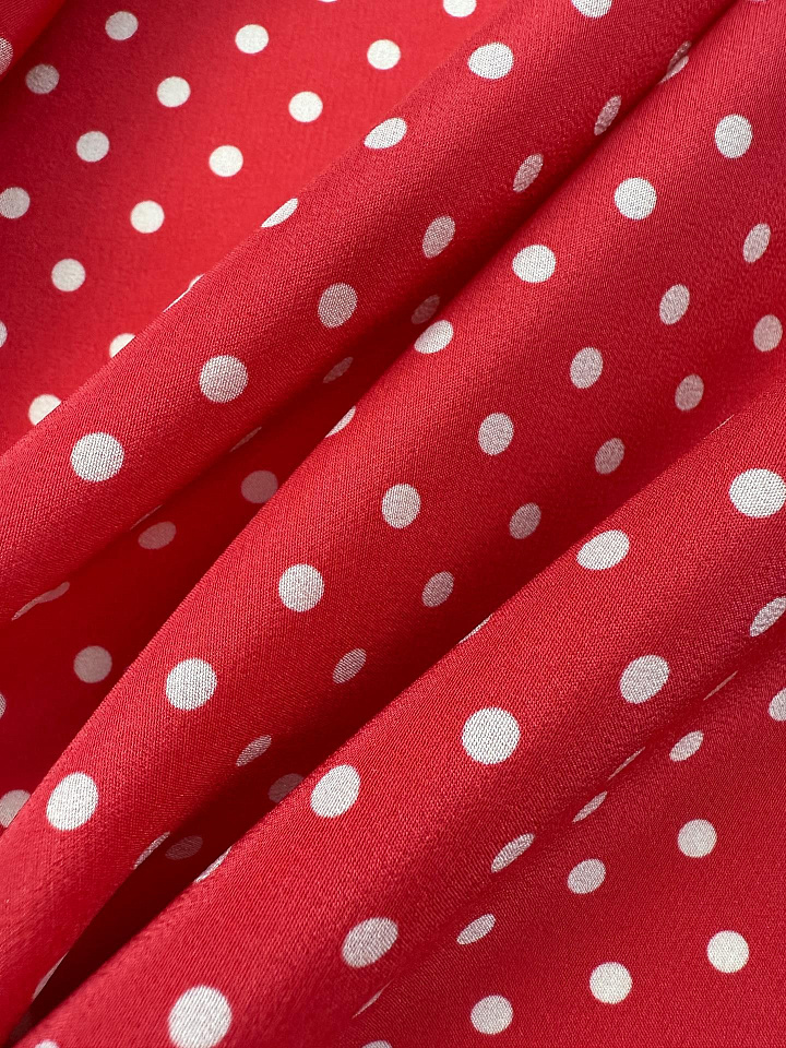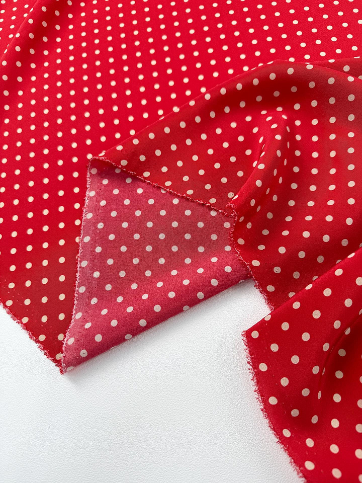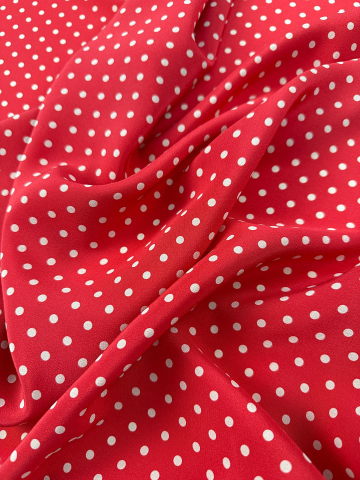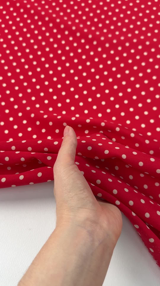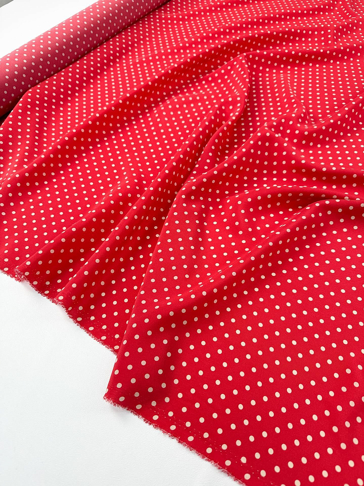 Крепдешин (н) светло-бежевый горох на красном - цена 5 800 ₽ У нас самые доступные цены на в Москве, доставка по всей России - интернет магазин тканей Тессутидея. Артикул товара для заказа - 10-4817. Страна производства ткани – Италия. Ширина этого материала - 140. Состав - Шелк 100%. Наличие остатков на складе - 15.9 м