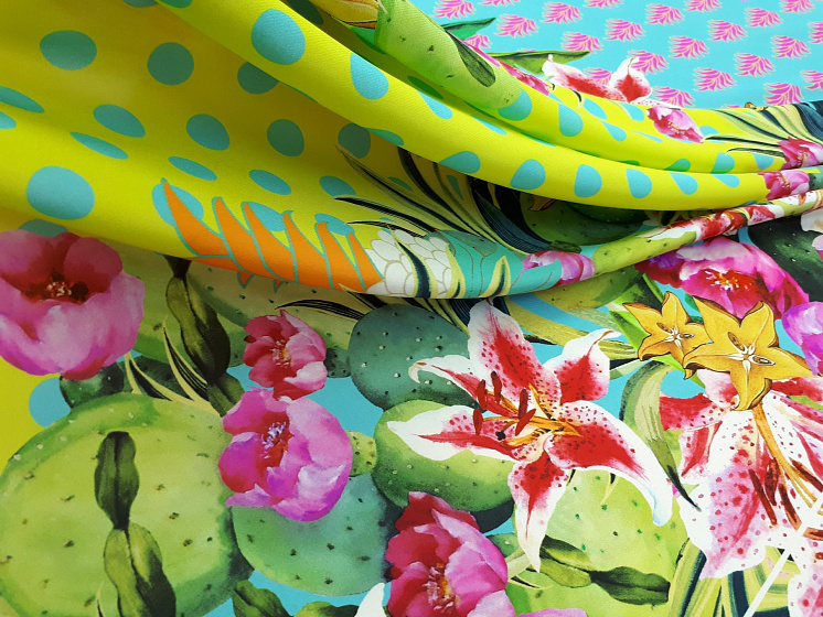 Крепдешин стрейч купон (0,9м) (н) яркий цветочный орнамент и горох на желто-голубом - цена 3 800 ₽ У нас самые доступные цены на Крепы шелковые в Москве, доставка по всей России - интернет магазин тканей Тессутидея. Артикул товара для заказа - 02-8225. Страна производства ткани – Италия. Ширина этого материала - 135. Состав - Шелк 96% эластан 4%. Наличие остатков на складе - 4.4 м