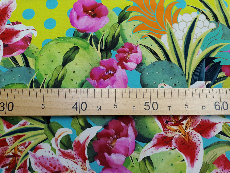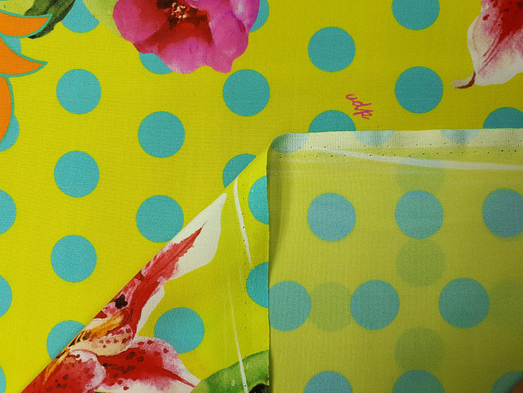 Крепдешин стрейч купон (0,9м) (н) яркий цветочный орнамент и горох на желто-голубом Арт. 02-8225