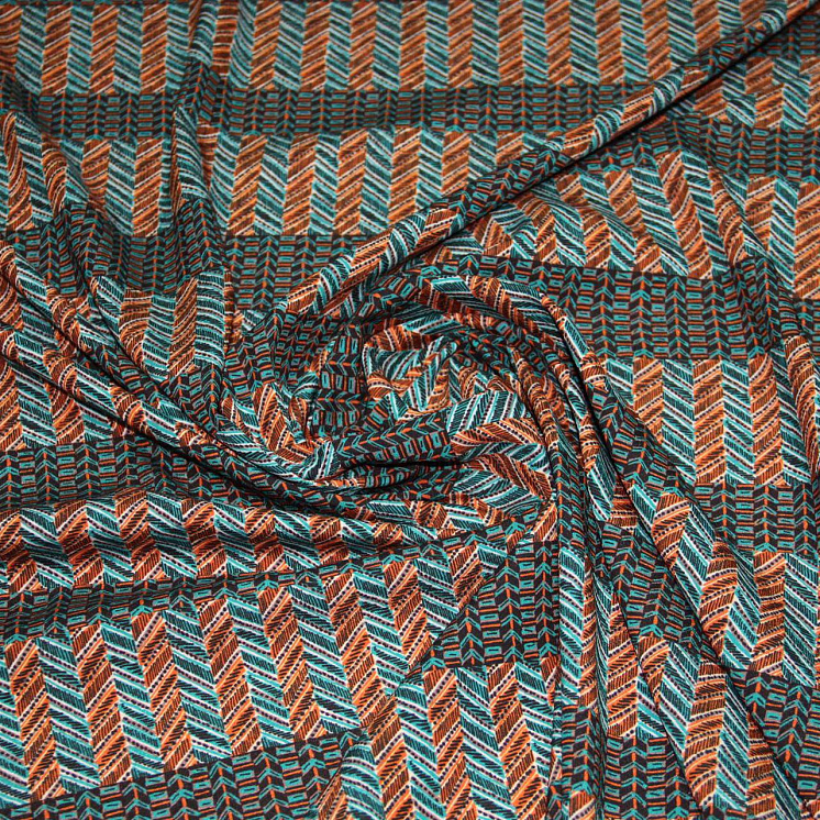 Крепдешин стрейч (н) бирюзово-оранжевый геометрический орнамент - цена 2 500 ₽ У нас самые доступные цены на Крепы шелковые в Москве, доставка по всей России - интернет магазин тканей Тессутидея. Артикул товара для заказа - 03-3238. Страна производства ткани – Италия. Ширина этого материала - 140. Состав - Ацетат 97% эластан 3%. Наличие остатков на складе - 2.9 м