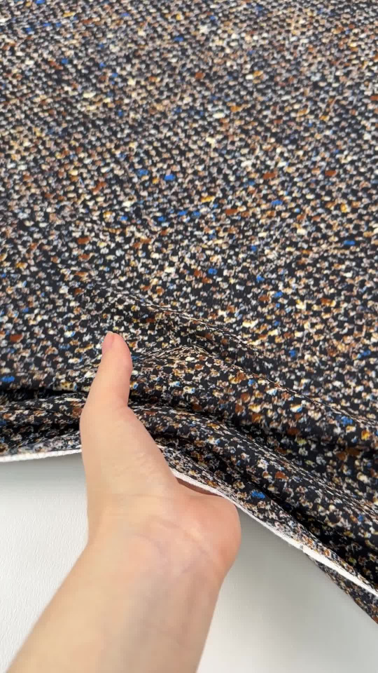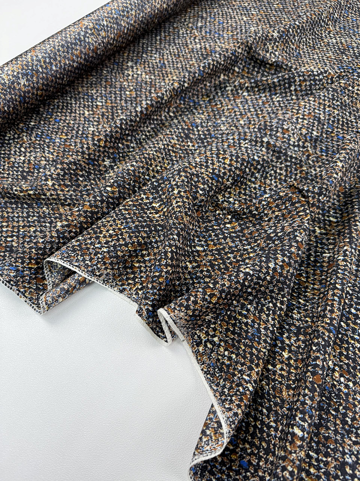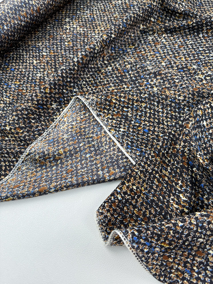 Крепдешин стрейч (н) мелкий коричнево-голубой рисунок на черном - цена 5 400 ₽ У нас самые доступные цены на в Москве, доставка по всей России - интернет магазин тканей Тессутидея. Артикул товара для заказа - 10-4851. Страна производства ткани – Италия. Ширина этого материала - 135. Состав - Шелк 96% эластан 4%. Наличие остатков на складе - 3.2 м