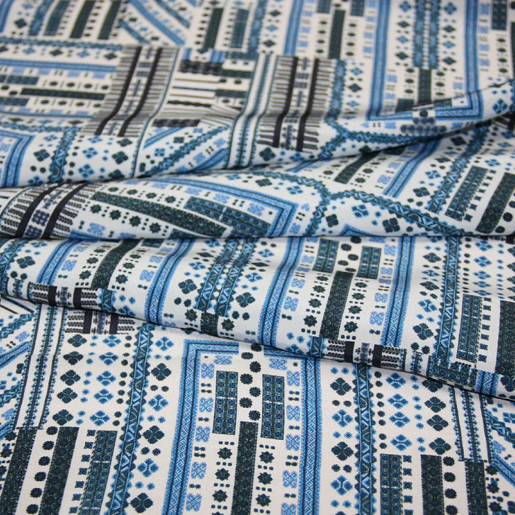 Крепдешин стрейч (н) сине-голубой геометрический орнамент на белом Арт. 02-5533