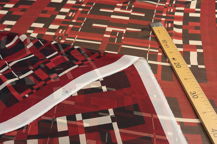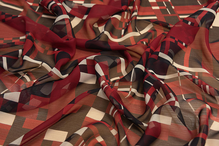 Крепшифон (н) черно-бежево-бордовый геометрический орнамент в стиле Armani - цена 2 500 ₽ У нас самые доступные цены на Шифон в Москве, доставка по всей России - интернет магазин тканей Тессутидея. Артикул товара для заказа - 10-0892. Страна производства ткани – Италия. Ширина этого материала - 165. Состав - Шелк 100%. Наличие остатков на складе - 1 м