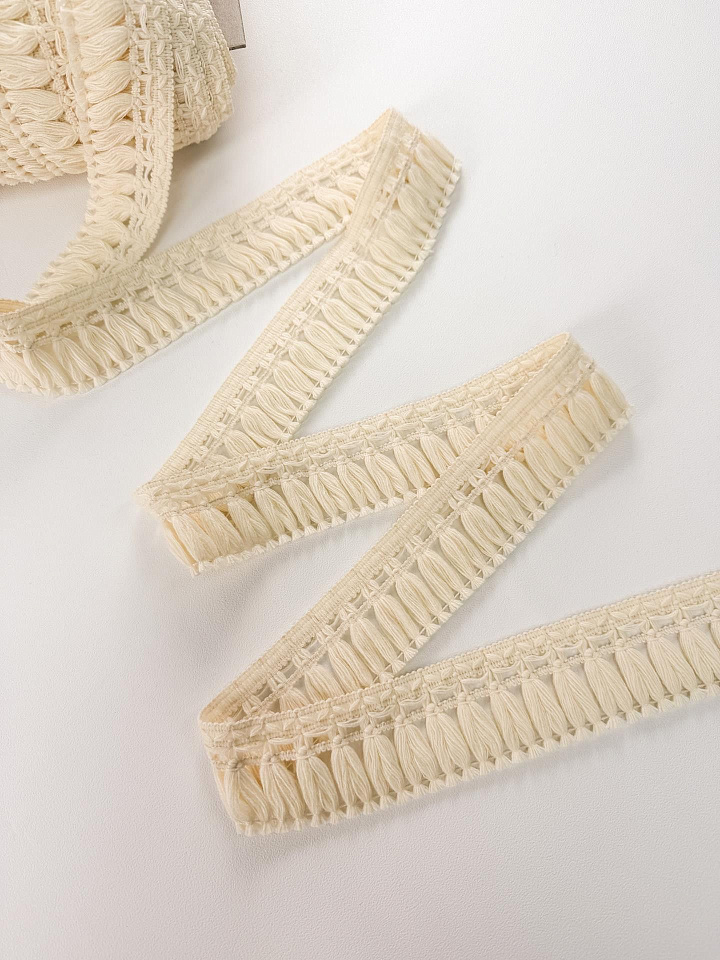 Кружевная тесьма с бахромой ш-5см молочная - цена 450 ₽ У нас самые доступные цены на в Москве, доставка по всей России - интернет магазин тканей Тессутидея. Артикул товара для заказа - 03-7465. Страна производства ткани – Италия. Ширина этого материала - 5. Состав - Акрил 100%. Наличие остатков на складе - 49.55 м