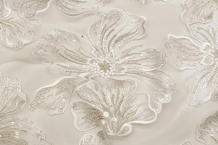 Кружевное полотно на сетке с люрексом (н) бело-серебряные цветы расшитые пайетками Арт. 03-7206