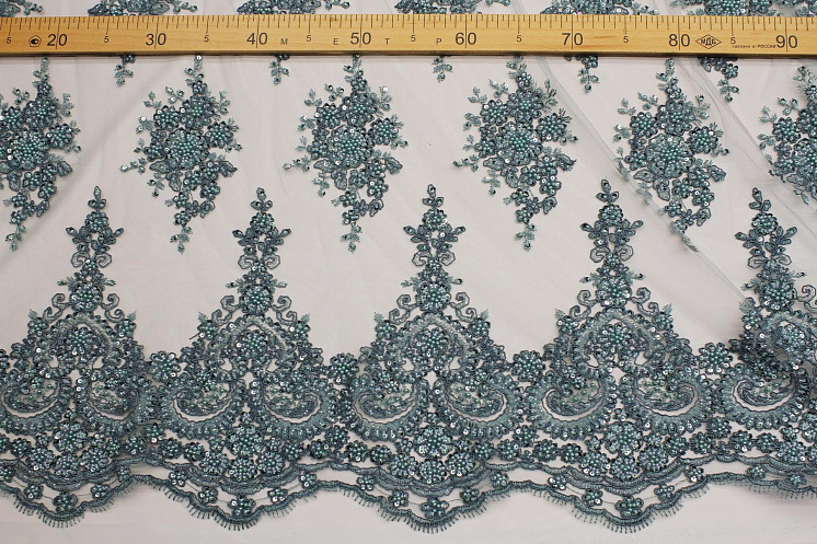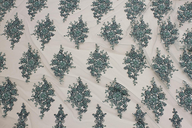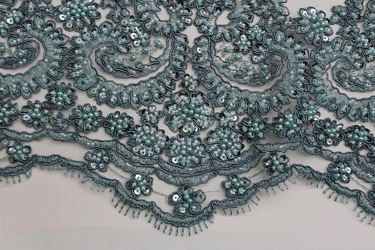 Кружевное полотно расшитое жемчугом, стеклярусом и пайетками (о) серо-зеленое Арт. 03-6942