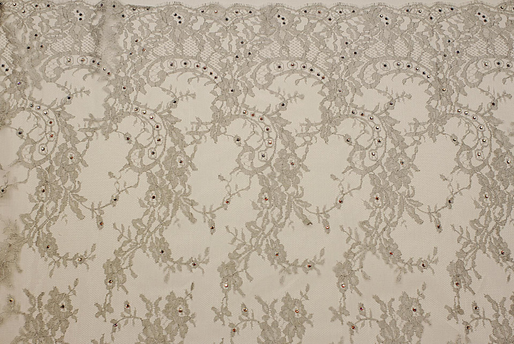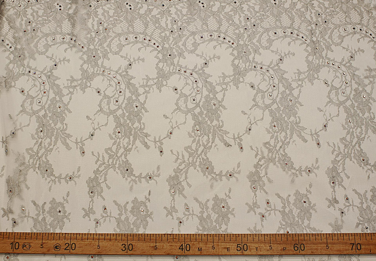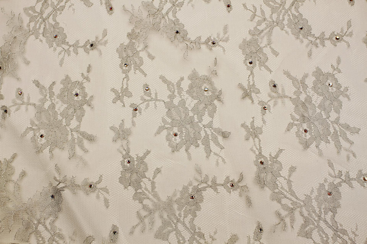 Кружево с люрексом и стразами (о) светло-серое ш-95см - цена 10 500 ₽ У нас самые доступные цены на Кружевные ткани в Москве, доставка по всей России - интернет магазин тканей Тессутидея. Артикул товара для заказа - 03-7171. Страна производства ткани – Италия. Ширина этого материала - 95. Состав - Вискоза 40% полиамид 40% люрекс 20%. Наличие остатков на складе - 4.1 м