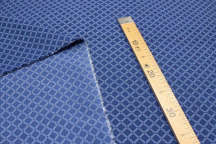 Плащевая (н) белый геометрический орнамент на синем - цена 850 ₽ У нас самые доступные цены на в Москве, доставка по всей России - интернет магазин тканей Тессутидея. Артикул товара для заказа - 11-0372. Страна производства ткани – Италия. Ширина этого материала - 155. Состав - Полиамид 100%. Наличие остатков на складе - 7.6 м
