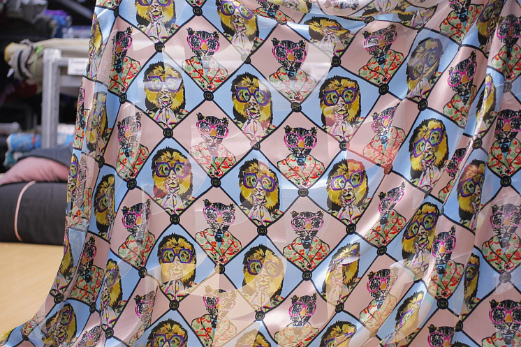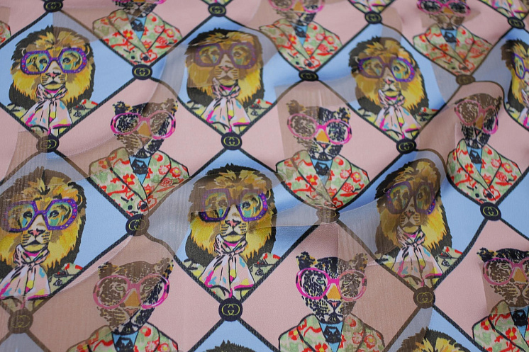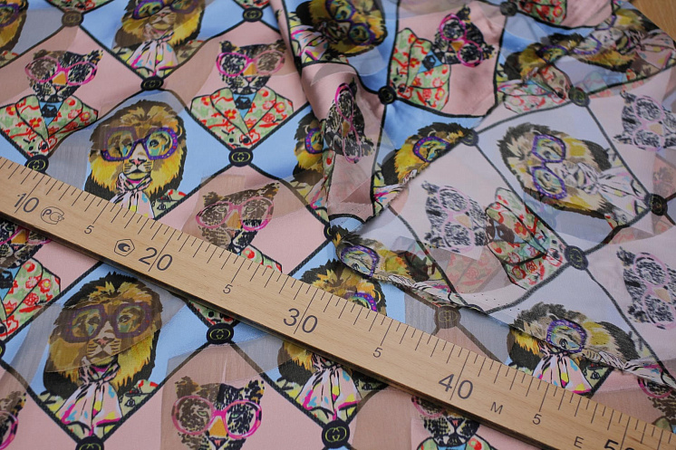 Плательная деворе (н) тигры и леопарды в очках на розово-голубом - цена 4 500 ₽ У нас самые доступные цены на Плательные ткани в Москве, доставка по всей России - интернет магазин тканей Тессутидея. Артикул товара для заказа - 10-3126. Страна производства ткани – Италия. Ширина этого материала - 140. Состав - Шелк 50% вискоза 50%. Наличие остатков на складе - 3.9 м