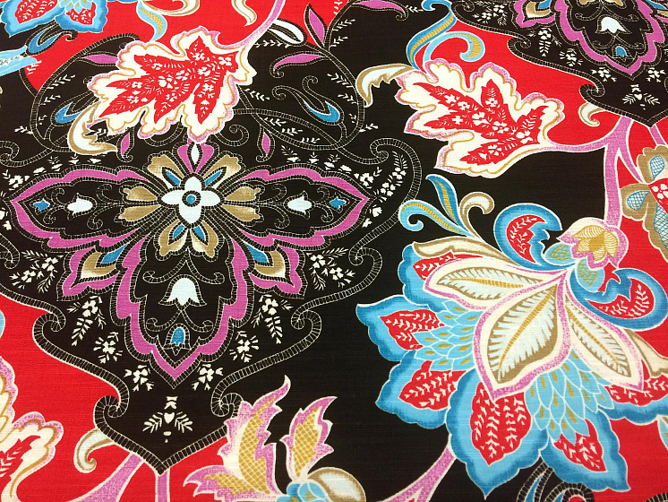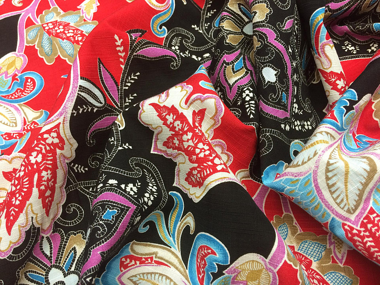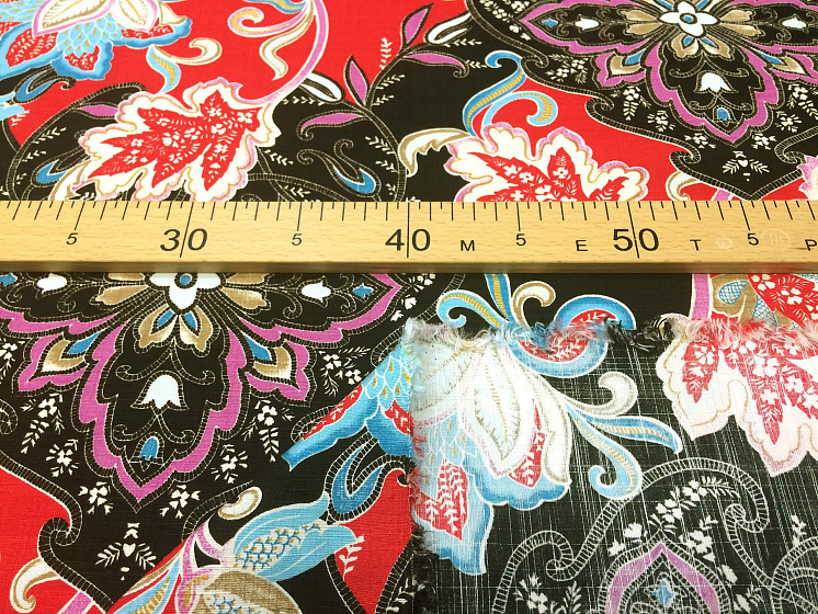 Плательная (н) крупный красно-черно-голубой растительный орнамент - цена 1 600 ₽ У нас самые доступные цены на в Москве, доставка по всей России - интернет магазин тканей Тессутидея. Артикул товара для заказа - 04-1098. Страна производства ткани – Италия. Ширина этого материала - 150. Состав - Вискоза 64% лен 36%. Наличие остатков на складе - 5.7 м