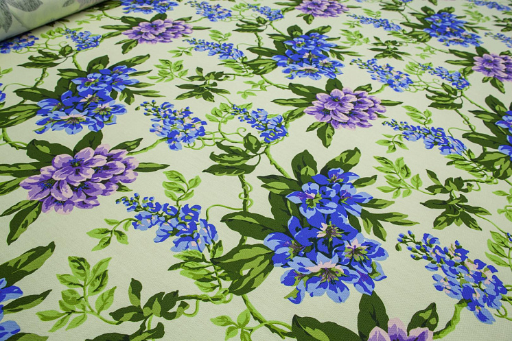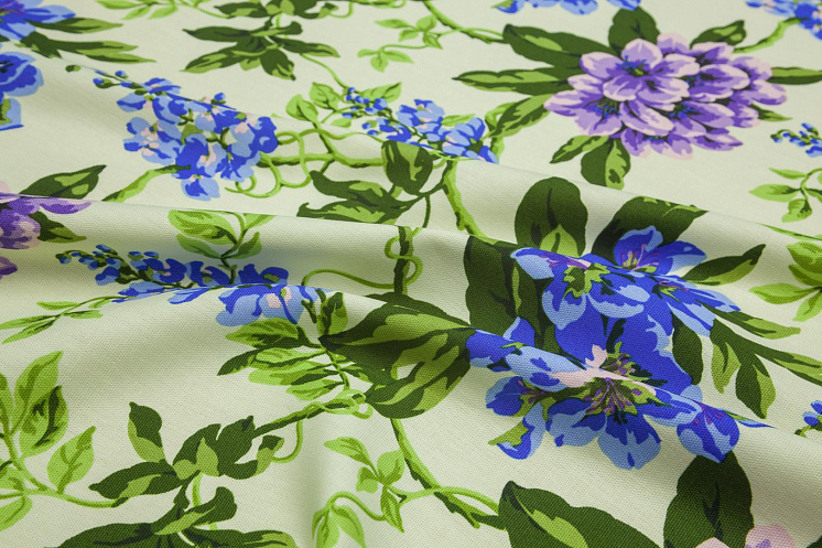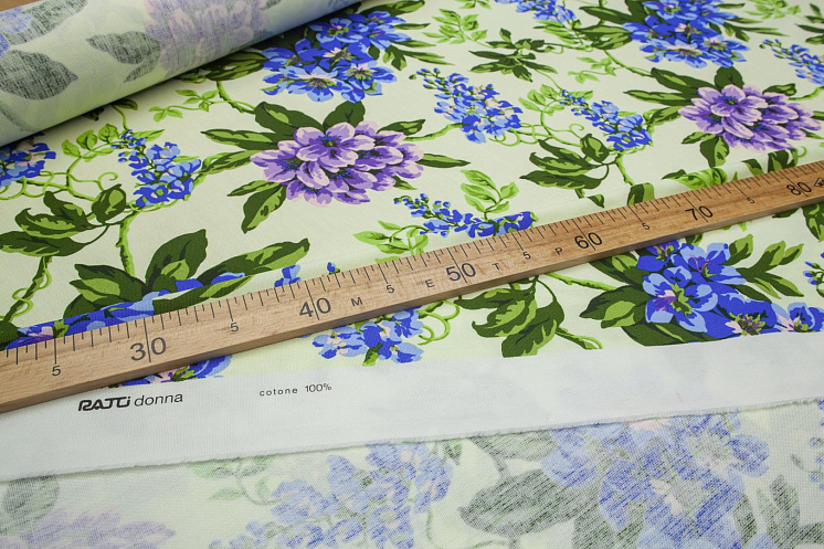 Плательная (н) сиренево-зелено-голубой цветочный орнамент на светло-зеленом - цена 1 600 ₽ У нас самые доступные цены на Хлопок набивной в Москве, доставка по всей России - интернет магазин тканей Тессутидея. Артикул товара для заказа - 01-4499. Страна производства ткани – Италия. Ширина этого материала - 150. Состав - Хлопок 100%. Наличие остатков на складе - 5.5 м