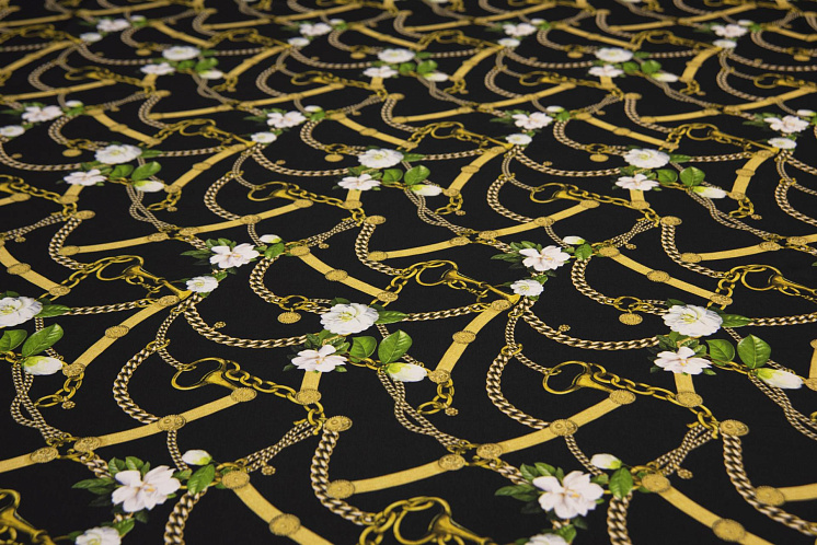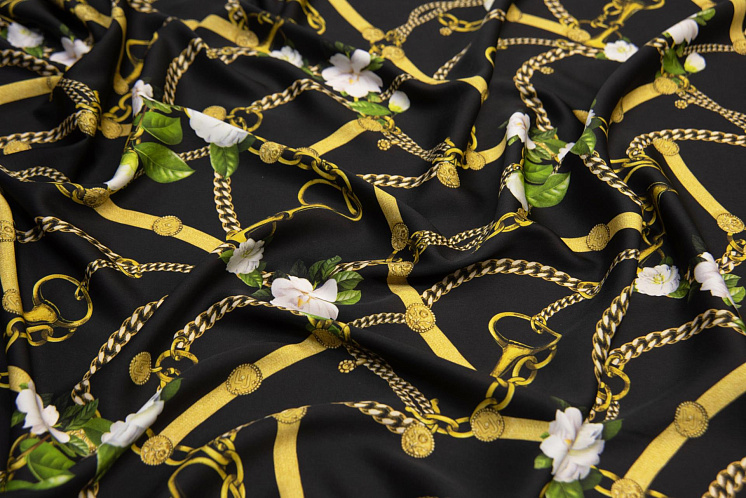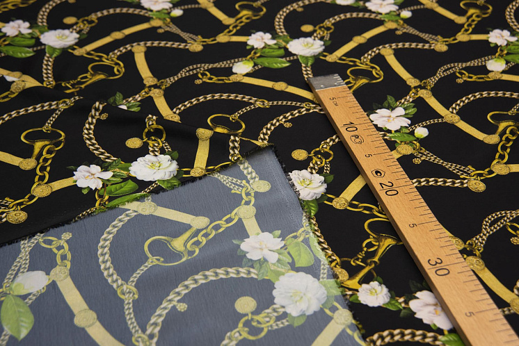 Плательная (н) цветы и цепи на черном - цена 1 200 ₽ У нас самые доступные цены на Плательные ткани в Москве, доставка по всей России - интернет магазин тканей Тессутидея. Артикул товара для заказа - 03-6199. Страна производства ткани – Италия. Ширина этого материала - 150. Состав - Полиамид 100%. Наличие остатков на складе - 3.7 м