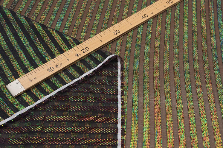 Плательная с люрексом (н) полосы из цветного люрекса на черном - цена 2 800 ₽ У нас самые доступные цены на Плательные ткани в Москве, доставка по всей России - интернет магазин тканей Тессутидея. Артикул товара для заказа - 03-6810. Страна производства ткани – Италия. Ширина этого материала - 135. Состав - Шелк 50% люрекс 50%. Наличие остатков на складе - 12.2 м