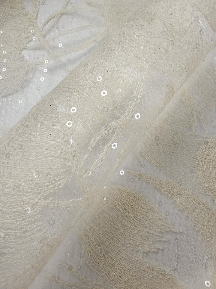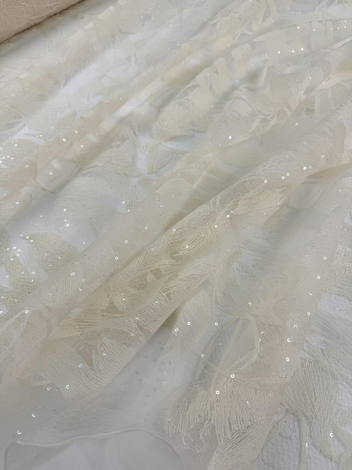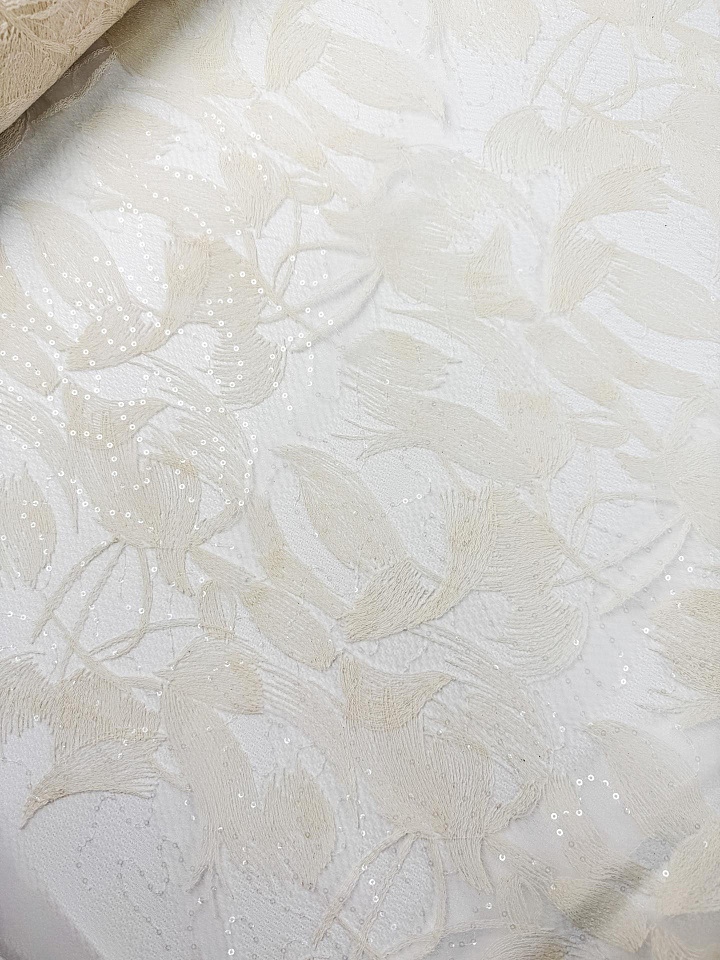 Плательная сетка (н) молочная вышивка и пайетки на белом - цена 8 500 ₽ У нас самые доступные цены на в Москве, доставка по всей России - интернет магазин тканей Тессутидея. Артикул товара для заказа - 03-7522. Страна производства ткани – Италия. Ширина этого материала - 130. Состав - Хлопок 40% полиамид 60%. Наличие остатков на складе - 9.6 м