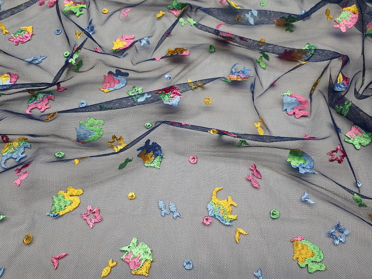 Плательная сетка с вышивкой (н) яркие рыбки на синем - цена 1 800 ₽ У нас самые доступные цены на Нарядные ткани и вышивка в Москве, доставка по всей России - интернет магазин тканей Тессутидея. Артикул товара для заказа - 03-5358. Страна производства ткани – Италия. Ширина этого материала - 140. Состав - Вискоза 20% полиамид 75% эластан 5%. Наличие остатков на складе - 4.3 м