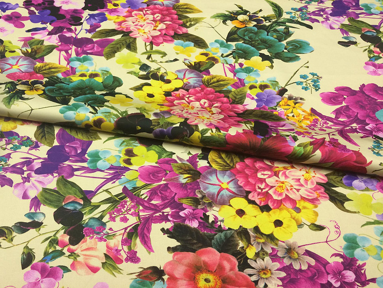 Плательная стрейч (н) крупный цветочный орнамент на бежевом - цена 1 600 ₽ У нас самые доступные цены на Хлопок набивной в Москве, доставка по всей России - интернет магазин тканей Тессутидея. Артикул товара для заказа - 01-4096. Страна производства ткани – Италия. Ширина этого материала - 150. Состав - Хлопок 97% эластан 3%. Наличие остатков на складе - 4.4 м