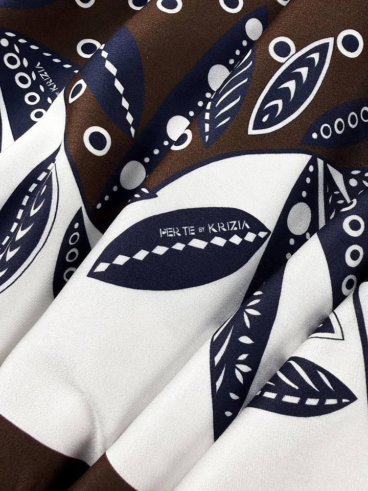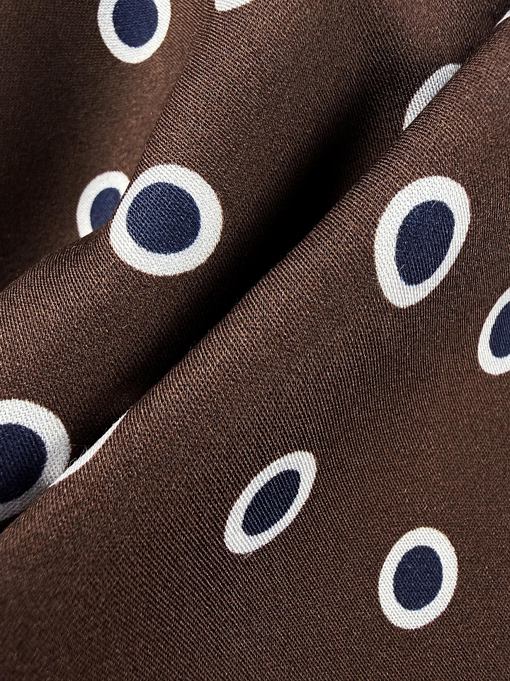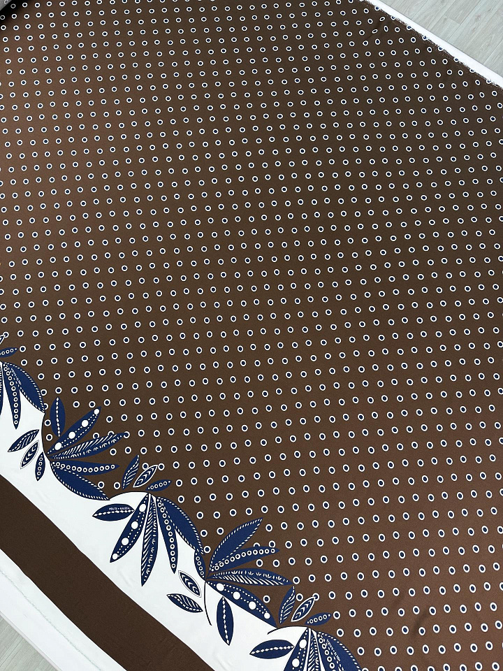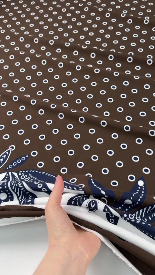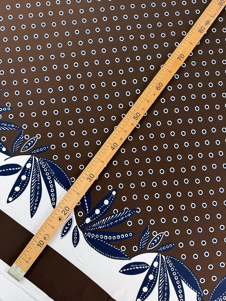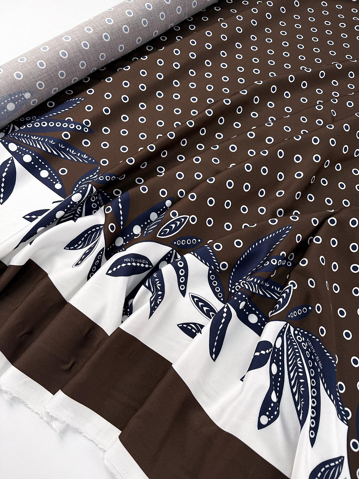 Плательная вискоза (н) сине-белый горох и бордюр на темно-коричневом - цена 2 800 ₽ У нас самые доступные цены на в Москве, доставка по всей России - интернет магазин тканей Тессутидея. Артикул товара для заказа - 04-1870. Страна производства ткани – Италия. Ширина этого материала - 140. Состав - Вискоза 100%. Наличие остатков на складе - 7.7 м