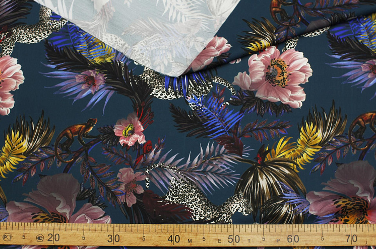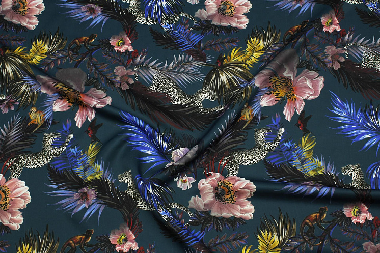 Плательная вискоза+шерсть 410 г/м (н) крупный растительный рисунок и животные на темно-сине-зеленом - цена 3 400 ₽ У нас самые доступные цены на Плательные ткани в Москве, доставка по всей России - интернет магазин тканей Тессутидея. Артикул товара для заказа - 04-1714. Страна производства ткани – Италия. Ширина этого материала - 140. Состав - Вискоза 87% шерсть 13%. Наличие остатков на складе - 18.8 м