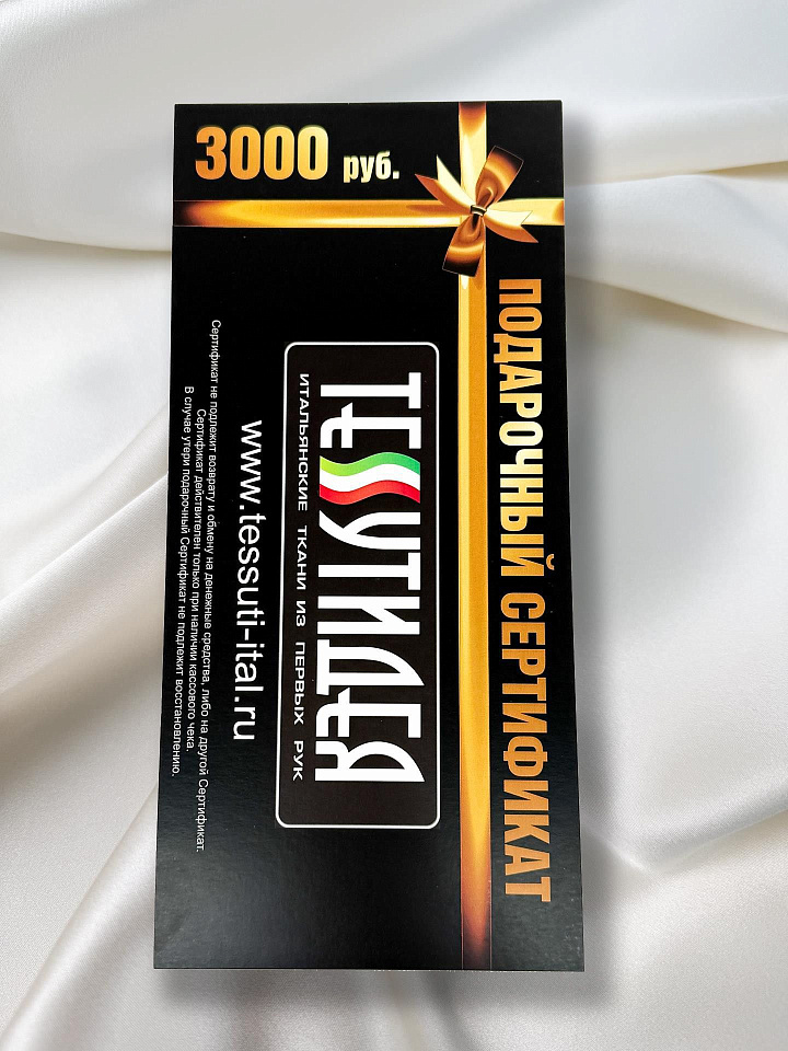 Подарочный сертификат на 3000 рублей - цена 3 000 ₽ У нас самые доступные цены на в Москве, доставка по всей России - интернет магазин тканей Тессутидея. Артикул товара для заказа - S-3000. Страна производства ткани – Россия. Ширина этого материала - . Состав - . Наличие остатков на складе - 50