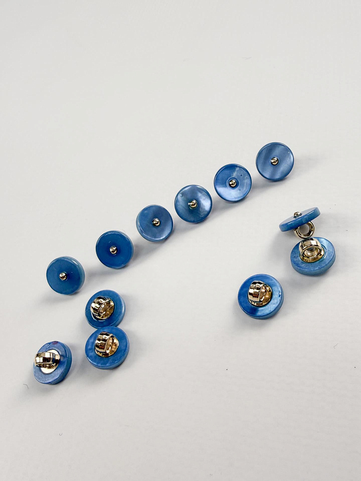 Пуговица комбинированная на ножке d-10мм голубая с золотой вставкой - цена 120 ₽ У нас самые доступные цены на в Москве, доставка по всей России - интернет магазин тканей Тессутидея. Артикул товара для заказа - F-7249. Страна производства ткани – Италия. Ширина этого материала - . Состав - Ракушка, пластик. Наличие остатков на складе - 100