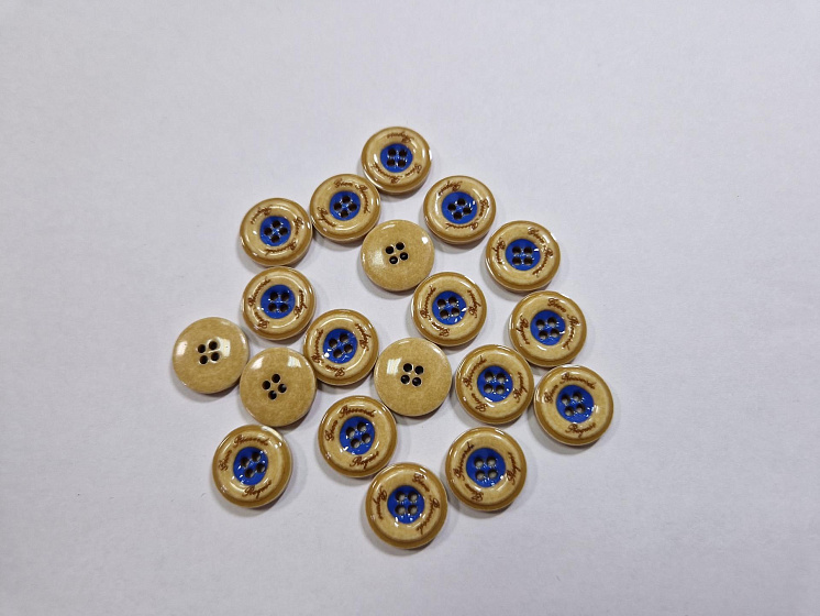Пуговица костюмная пластик 4 прокола d-15мм бежево-голубая с надписью Арт. F-6019