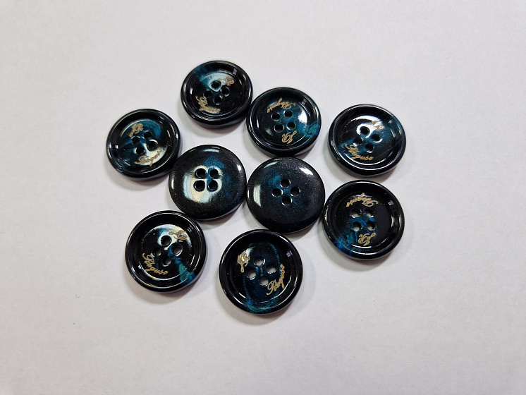 Пуговица костюмная пластик 4 прокола d-20мм черно-голубая с надписью Арт. F-5979