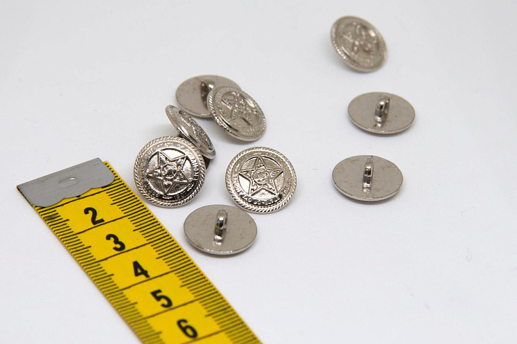 Пуговица металл серебро на ножке d-15мм со звездой - цена 80 ₽ У нас самые доступные цены на в Москве, доставка по всей России - интернет магазин тканей Тессутидея. Артикул товара для заказа - F-4580. Страна производства ткани – Италия. Ширина этого материала - . Состав - Металл. Наличие остатков на складе - 40