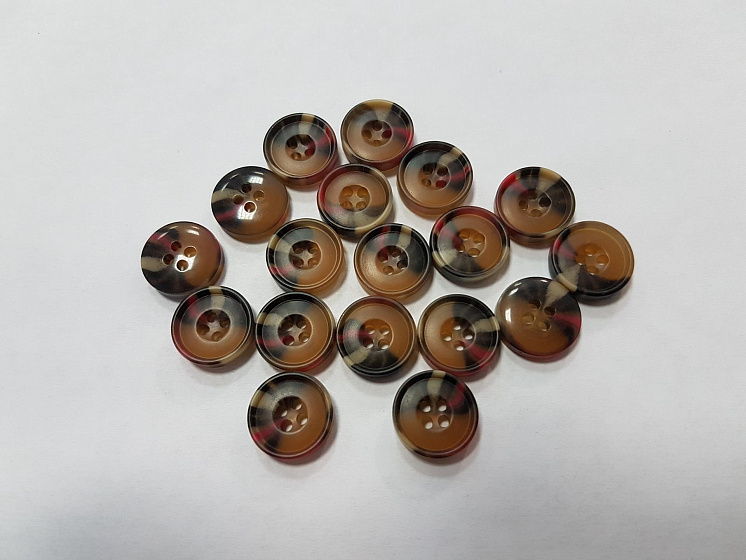 Пуговица пластик 4 прокола d-13мм светло-коричневая с красно-черными прожилками Арт. F-4898