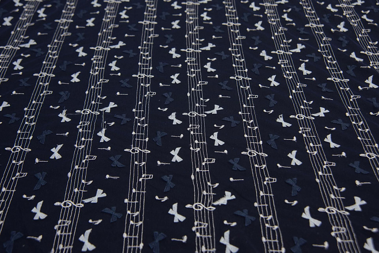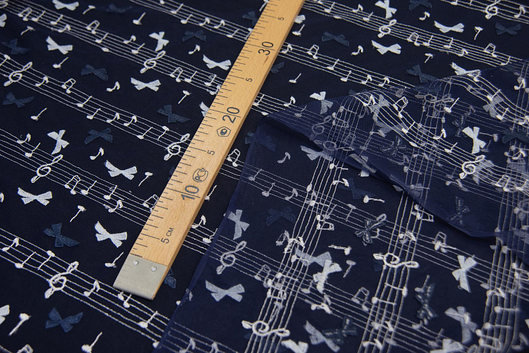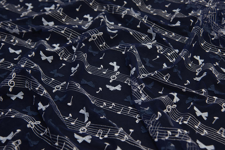 Сетка (н) банты и ноты на темно-синем - цена 3 200 ₽ У нас самые доступные цены на Сетки и фатин в Москве, доставка по всей России - интернет магазин тканей Тессутидея. Артикул товара для заказа - 03-6460. Страна производства ткани – Италия. Ширина этого материала - 145. Состав - Полиамид 100%. Наличие остатков на складе - 1.8 м
