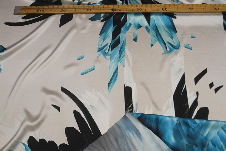 Шелк атлас купон (1,4м) (н) крупные черно-бирюзовые перья на белом Арт. 10-3952